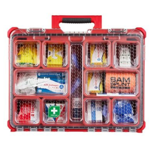 The MILWAUKEE® PACKOUT™ Class B Type III First Aid Kit is part of the most versatile, durable, modular storage system. The Milwaukee first aid kit’s impact-resistant body keeps contents safe from drops and bumps on the jobsite. An IP65 rated weather seal protects bandages, adhesives, antibiotics, and other essential medical supplies from rain and other jobsite debris. This jobsite first aid kit’s no-travel bin seals to keep all contents secure and in their proper place. The MILWAUKEE® PACKOUT™ Organizer comes with 193 essential first aid items tailored to the most common injuries you encounter on the jobsite. The transparent lid of the organizer seals the contents from migrating and shifting during transport. Heavy duty latches and reinforced hinges ensure that the organizer keeps the contents contained and protected.